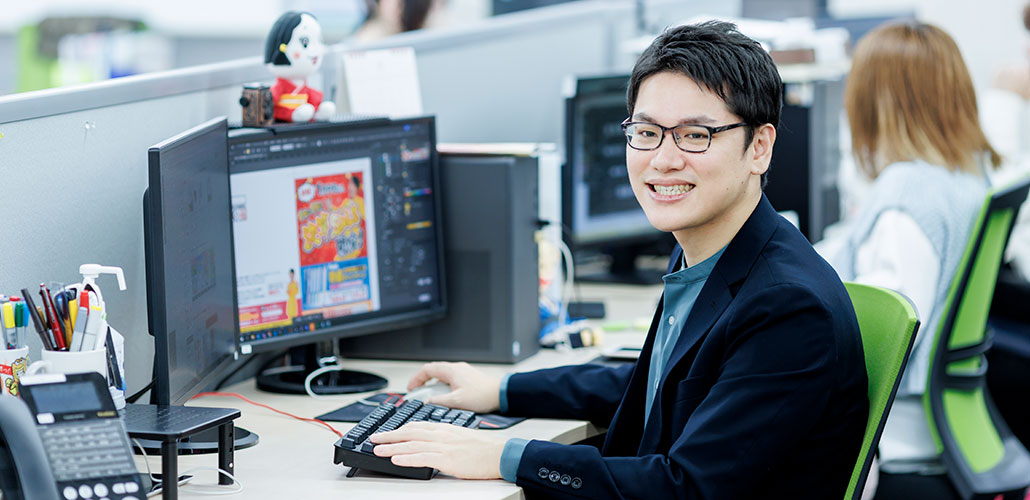 当社のデザイン業務は一般的なデザイン事務所とは少し違うかもしれませんが、お客様の販売促進やプロモーションのサポートをやりがいに変換できる方には面白い会社だと思います。デザインも選ばれる要素のひとつなので、結果はある程度数字から読み取れますが、実は今でも数字を見るのは怖いです。ただ、WEBは反応が悪くてもすぐに改善を加えて再トライができるので、修正内容を自分のなかにフィードバックして次に活かせるのがいいところですね。当社はWEBも紙もいろいろな商材の仕事が経験できるので、チャレンジできる場面は多いと思います。